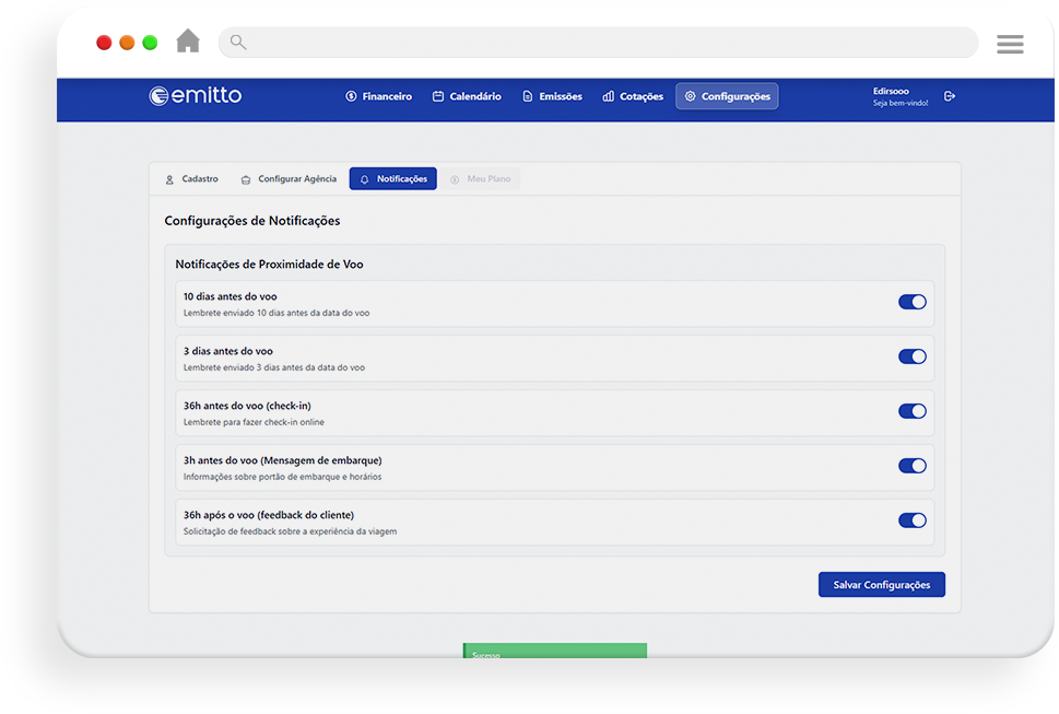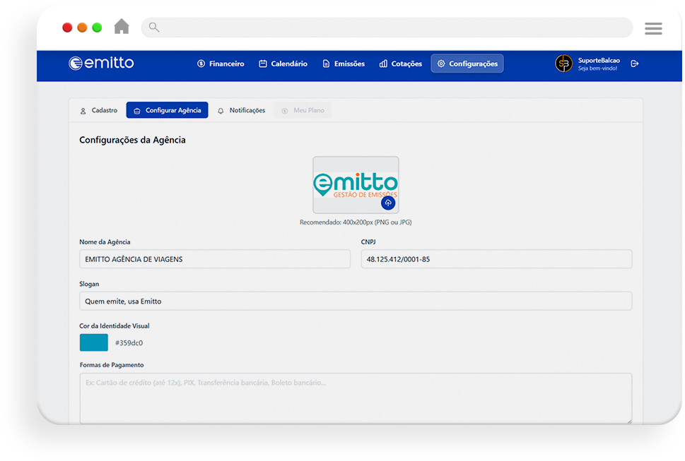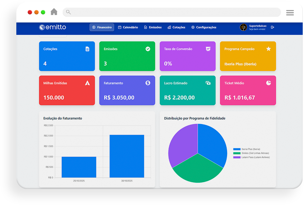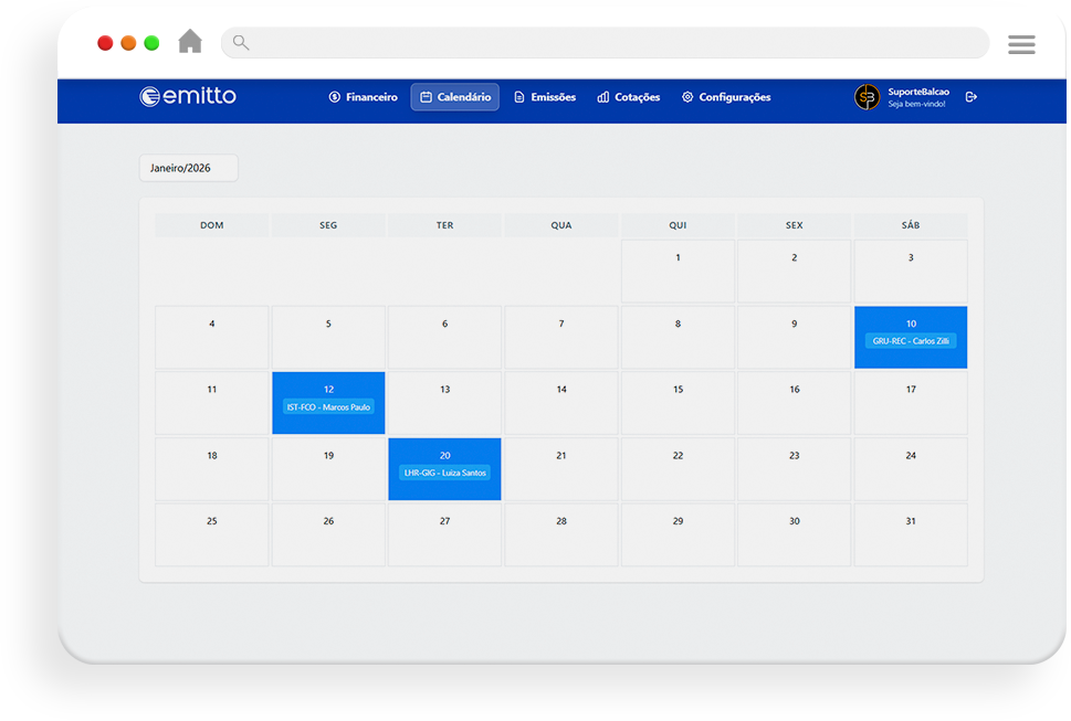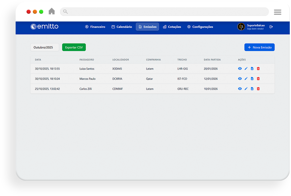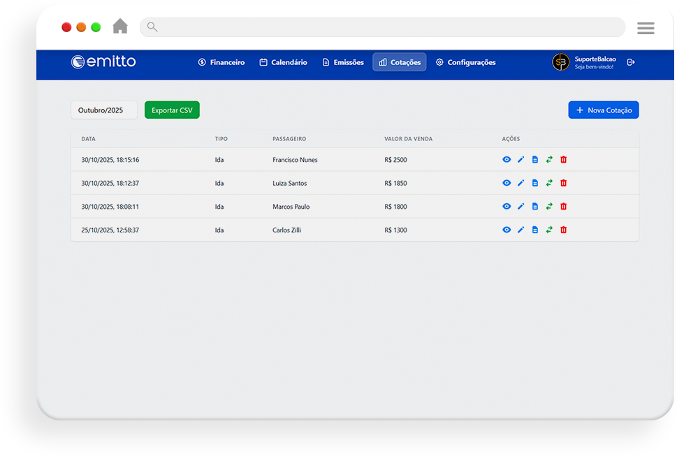 Centralize suas emissões, cotações e reservas em um só lugar! Com o Emitto, sua agência ganha agilidade, controle e segurança em todas as etapas, desde o cadastro da cotação até o envio do bilhete final ao cliente.